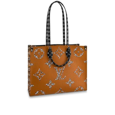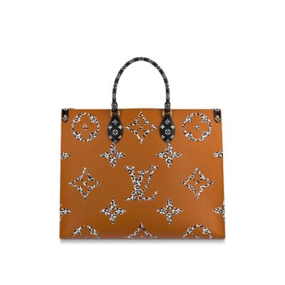 The Onthego tote bag takes on a bold new look in coated canvas with a print combining multiple sizes of the Monogram motif with leopard and zebra skin patterns. Its generous capacity, removable shoulder straps, and top handles make the Onthego perfect for everyday use.