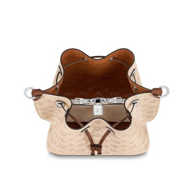 The Muria bucket bag is made from Mahina calf, a perforated leather with a discreet Monogram motif. Supple and sophisticated, it is a pleasure to carry, either by the braided top handle or the long leather strap, which adjusts for short- and long-shoulder or hands-free cross-body wear. Crafted signature details include a name tag and keybell in smooth calfskin.