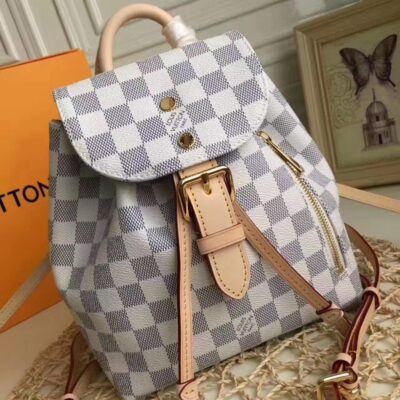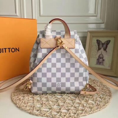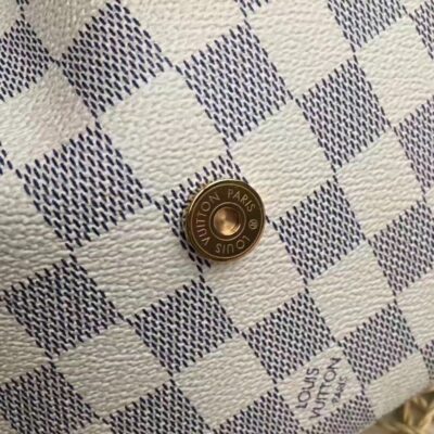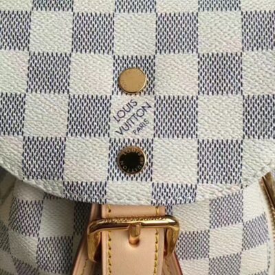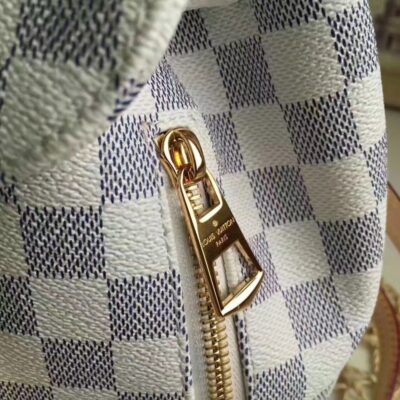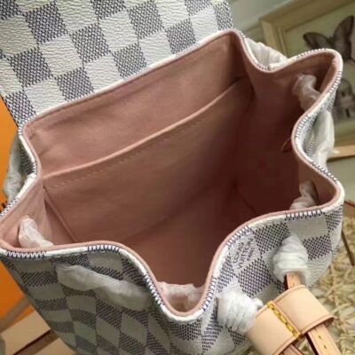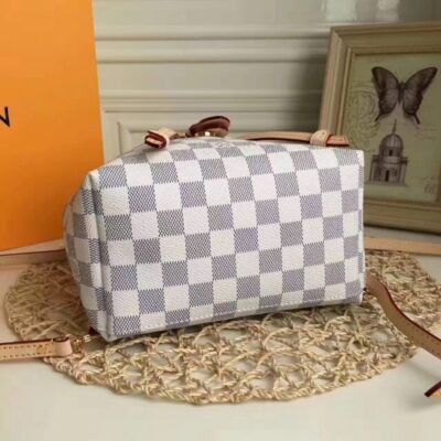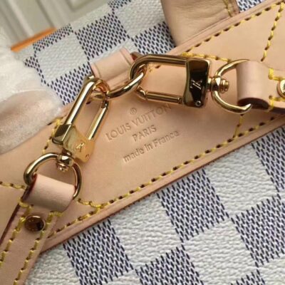 18.5 x 28 x 11.5 cm (Length x heightx width ) •7.3 x 11 x 4.5 inches•Damier Azur coated canvas exterior•Rose Ballerine microfiber lining•Natural cowhide leather trim•Shiny Gold colored metallic pieces•Puffed handle•2 adjustable flat shoulder / cross•body straps•Drawstring top closure secured by a flap and prong buckle closing system with magnet•Exterior zipped pocket•Interior smartphone pocket•Interior D•ring